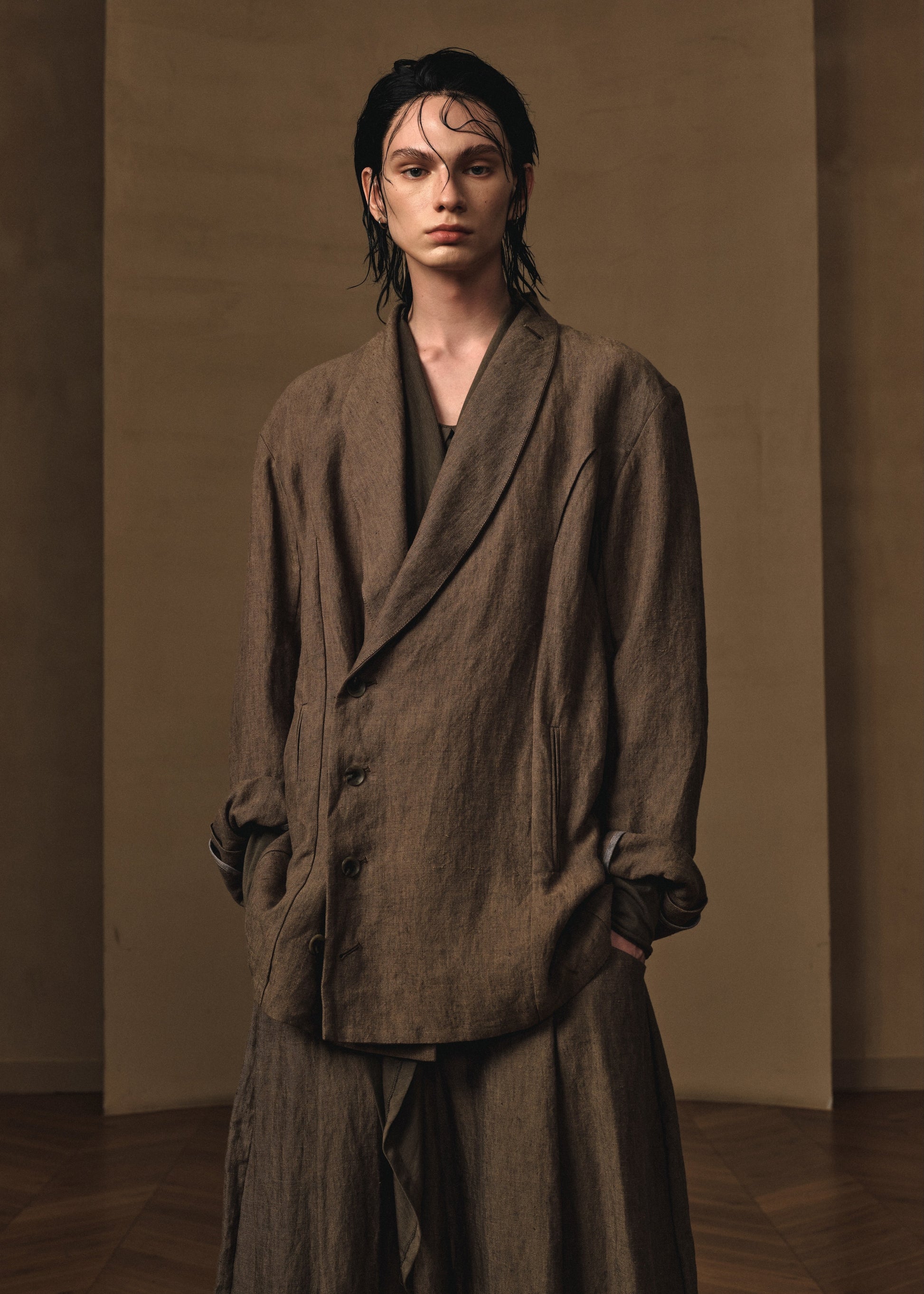 Shawl-collar cross body blazer in hemp fabric,there is a hidden pocket on the chest and four dividing lines on the front and back,Combination of casual and formal